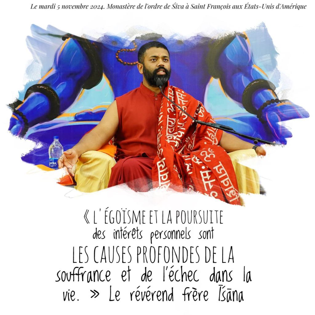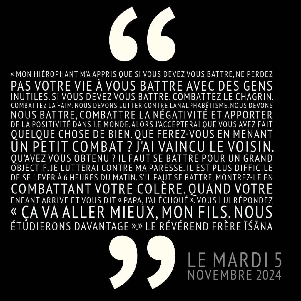 « Mon hiérophant m’a appris que si vous devez vous battre, ne perdez pas votre vie à vous battre avec des gens inutiles. Si vous devez vous battre, combattez le chagrin. Combattez la faim. Nous devons lutter contre l’analphabétisme. Nous devons nous battre, combattre la négativité et apporter de la positivité dans le monde. Alors j’accepterai que vous avez fait quelque chose de bien. Que ferez-vous en menant un petit combat ? J’ai vaincu le voisin. Qu’avez vous obtenu ? Il faut se battre pour un grand objectif. Je lutterai contre ma paresse. Il est plus difficile de se lever à 6 heures du matin. S’il faut se battre, montrez-le en combattant votre colère. Quand votre enfant arrive et vous dit « papa, J’ai échoué ». Vous lui répondez « Ça va aller mieux, mon fils. Nous étudierons davantage ».» Le révérend frère Īśāna