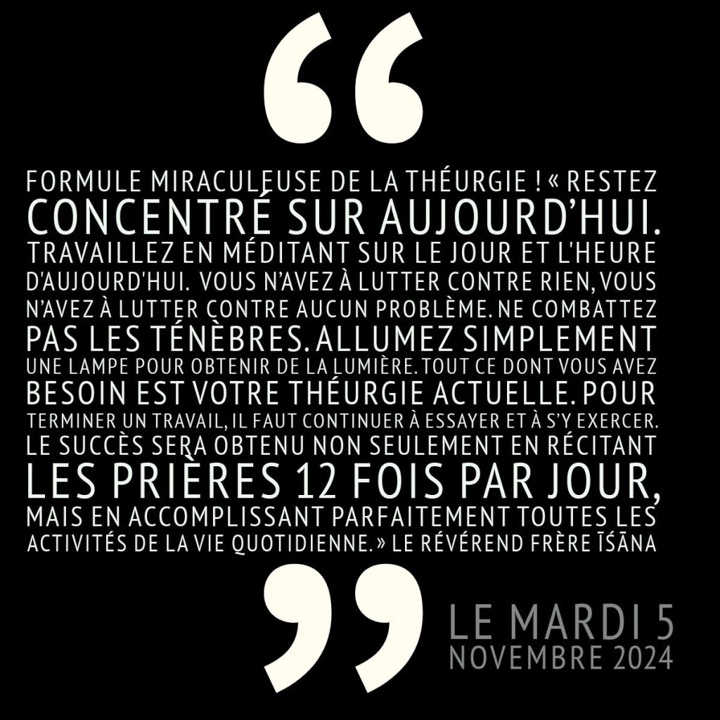 Formule miraculeuse de la théurgie ! « Restez concentré sur aujourd’hui. Travaillez en méditant sur le jour et l’heure d’aujourd’hui. Vous n’avez à lutter contre rien, vous n’avez à lutter contre aucun problème. Ne combattez pas les ténèbres. Allumez simplement une lampe pour obtenir de la lumière. Tout ce dont vous avez besoin est votre théurgie actuelle. Pour terminer un travail, il faut continuer à essayer et à s’y exercer. Le succès sera obtenu non seulement en récitant les prières 12 fois par jour, mais en accomplissant parfaitement toutes les activités de la vie quotidienne. » Le révérend frère Īśāna