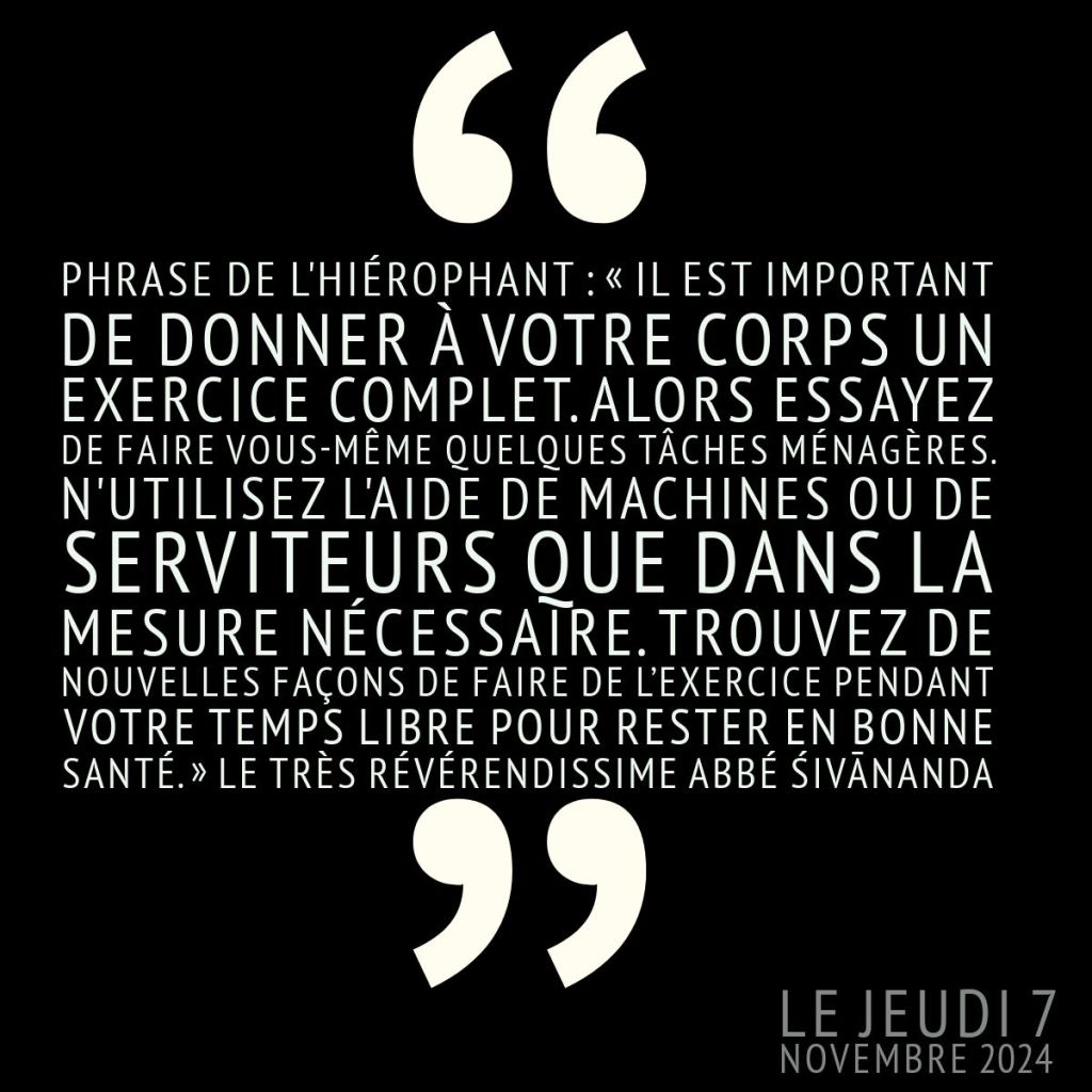 Phrase de l’hiérophant : « Il est important de donner à votre corps un exercice complet. Alors essayez de faire vous-même quelques tâches ménagères. N’utilisez l’aide de machines ou de serviteurs que dans la mesure nécessaire. Trouvez de nouvelles façons de faire de l’exercice pendant votre temps libre pour rester en bonne santé. » Le très révérendissime abbé Śivānanda